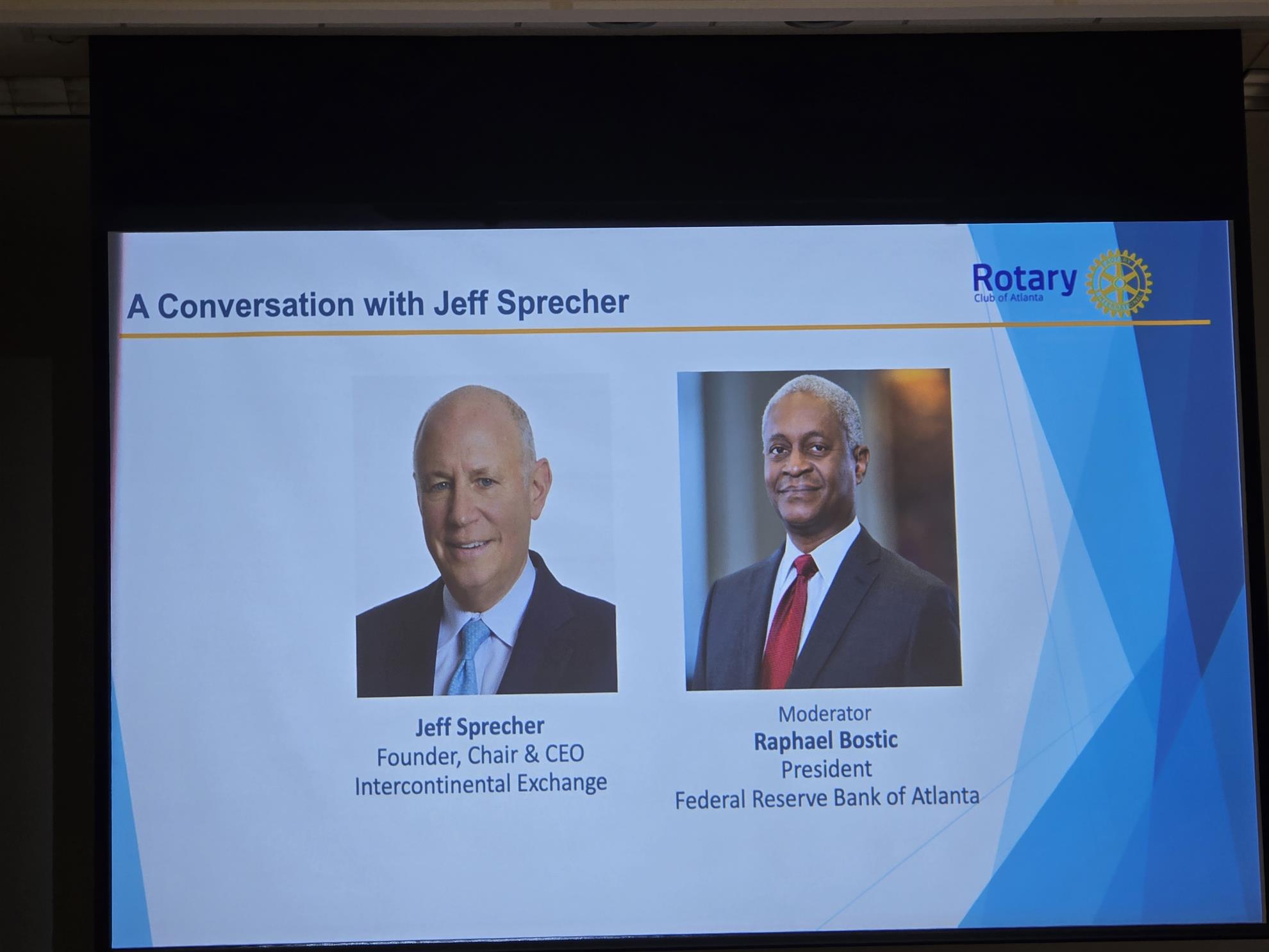 The conversation was moderated by Rotary Club of Atlanta member Raphael Bostic, President of the Federal Reserve Bank of Atlanta, who guided the discussion through themes including regulatory adaptation, economic stability, market modernization, and the future of digital exchange platforms.